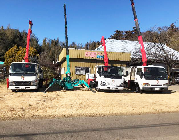 | 左から、作業車、狭所作業車、残土運搬車、水運搬車 | このトラックで、4人体制で資材を積んで参上します。 いつの日か、お目にかかるのを楽しみにしております |